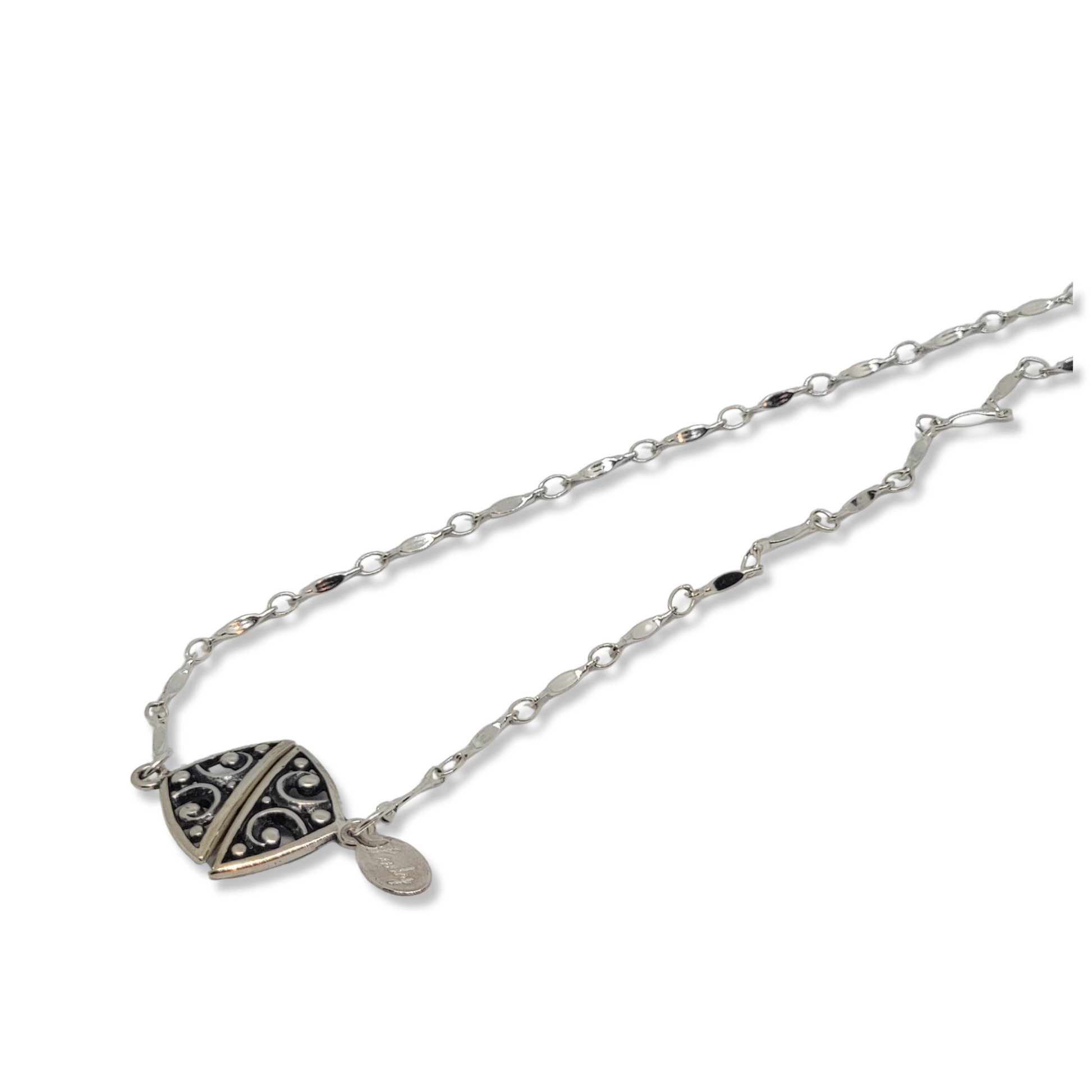 The Tawanda Necklace features beige handmade lampwork beads with grey, silver, and olive accents, Tiger's Eye gemstones, and decorative scroll elements for a timeless design.