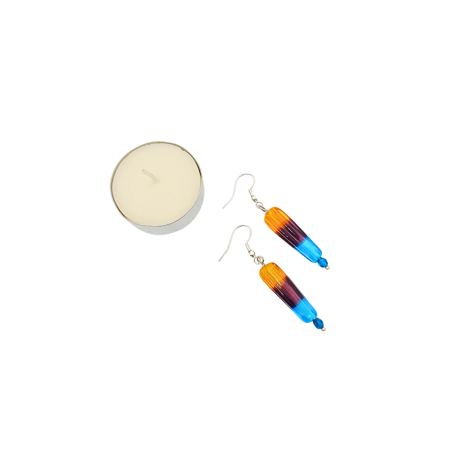 Bold handmade lampwork earrings with vibrant orange, purple & blue textured beads. Artisan-crafted sterling silver statement earrings. Eye-catching 1.5" design.